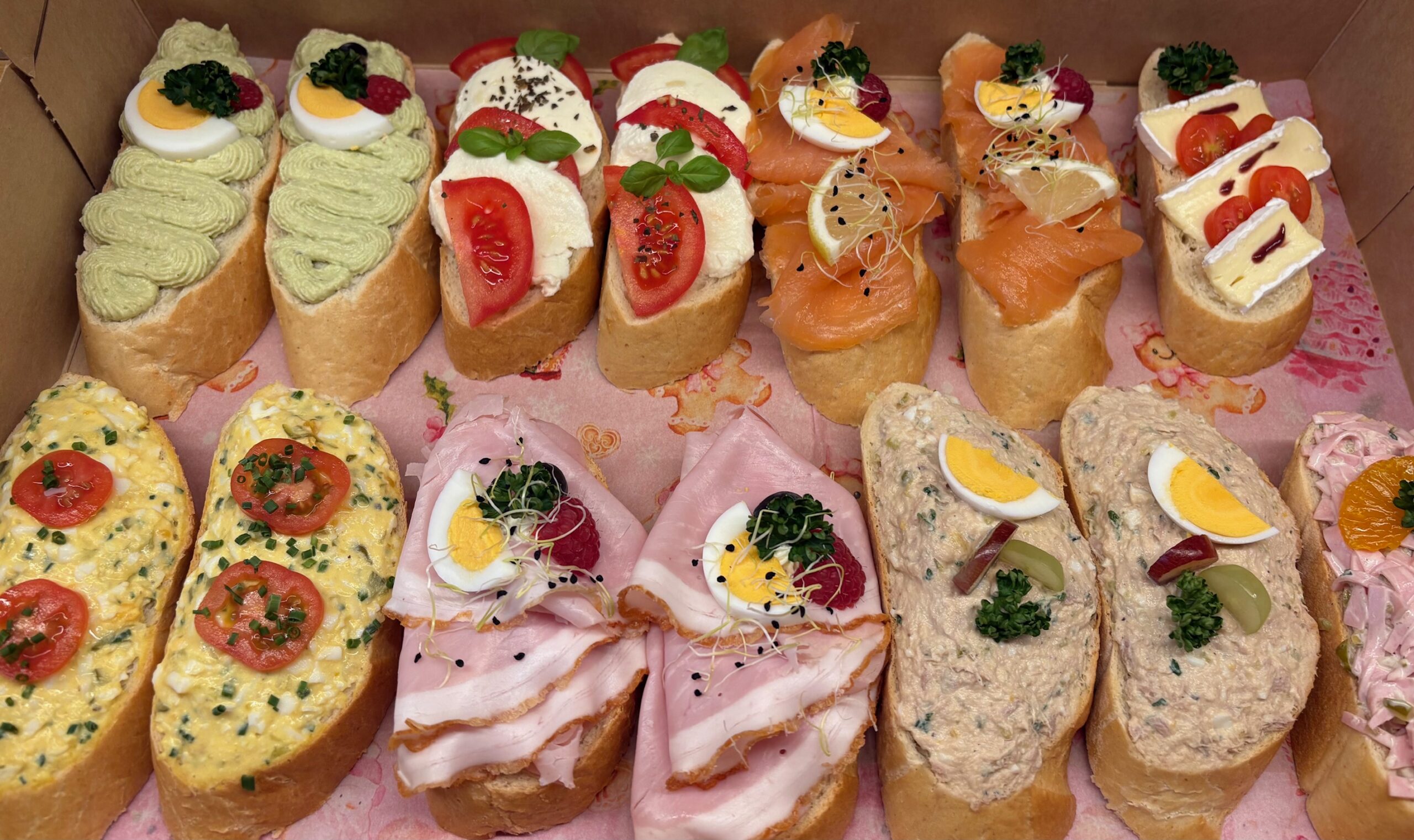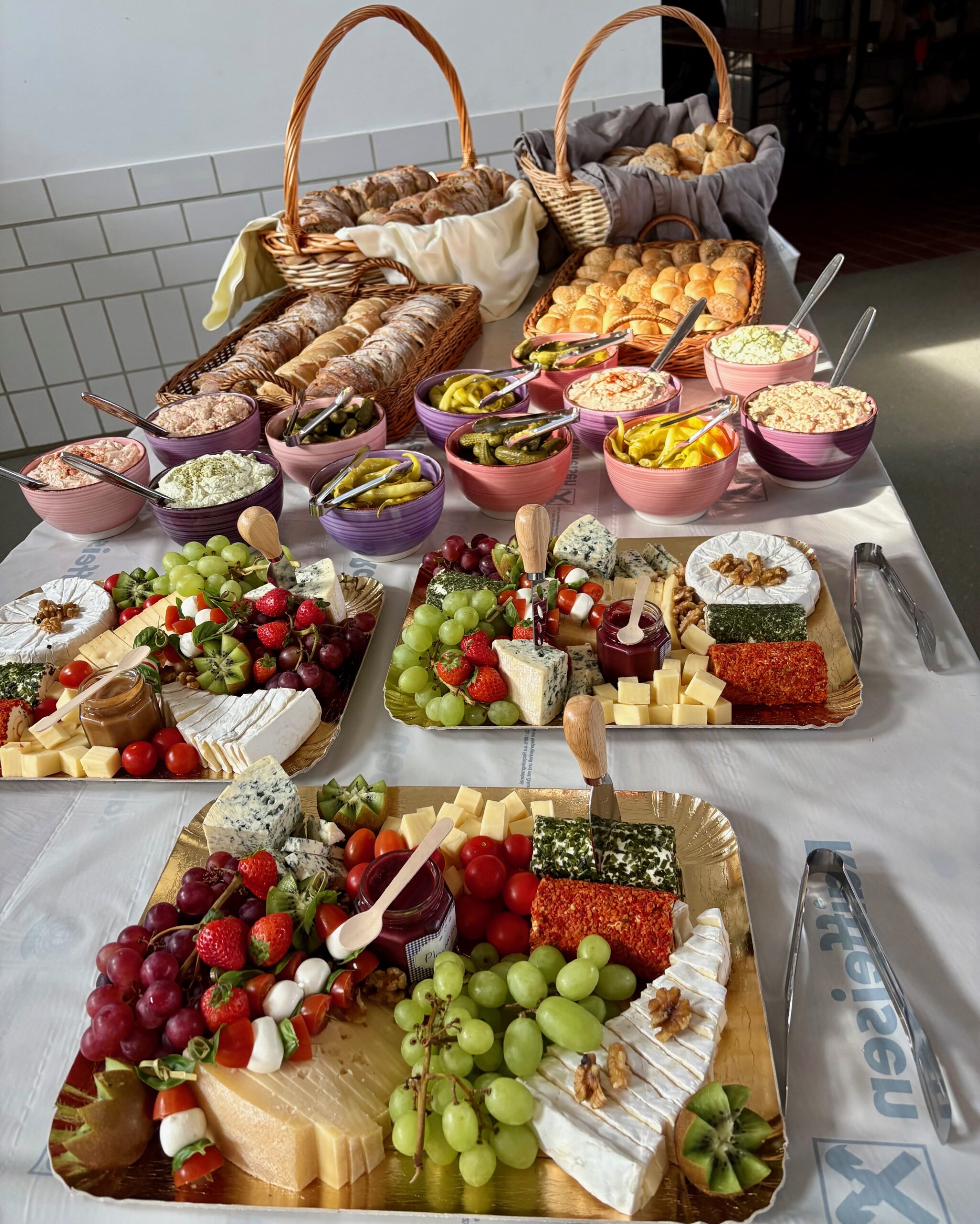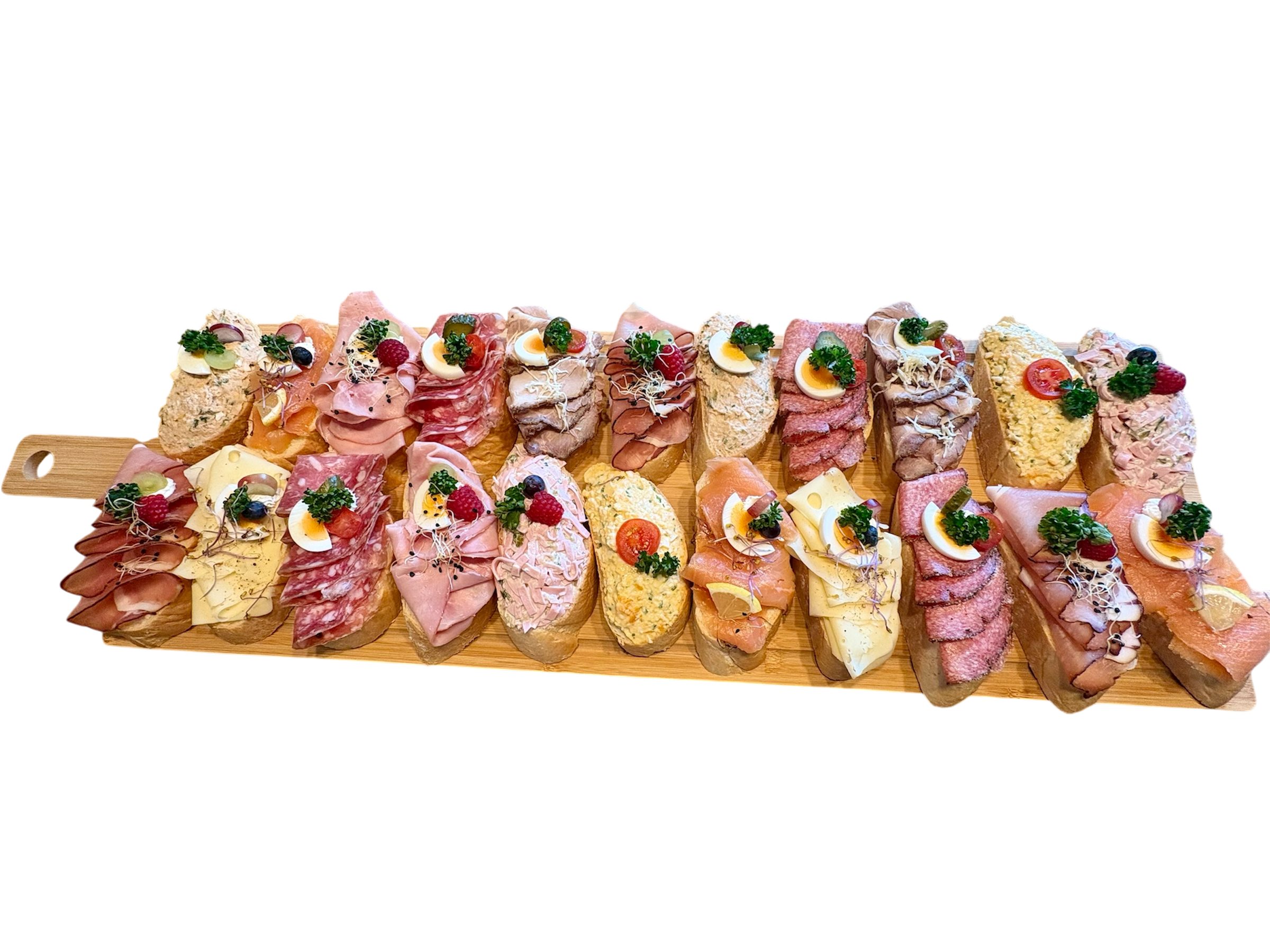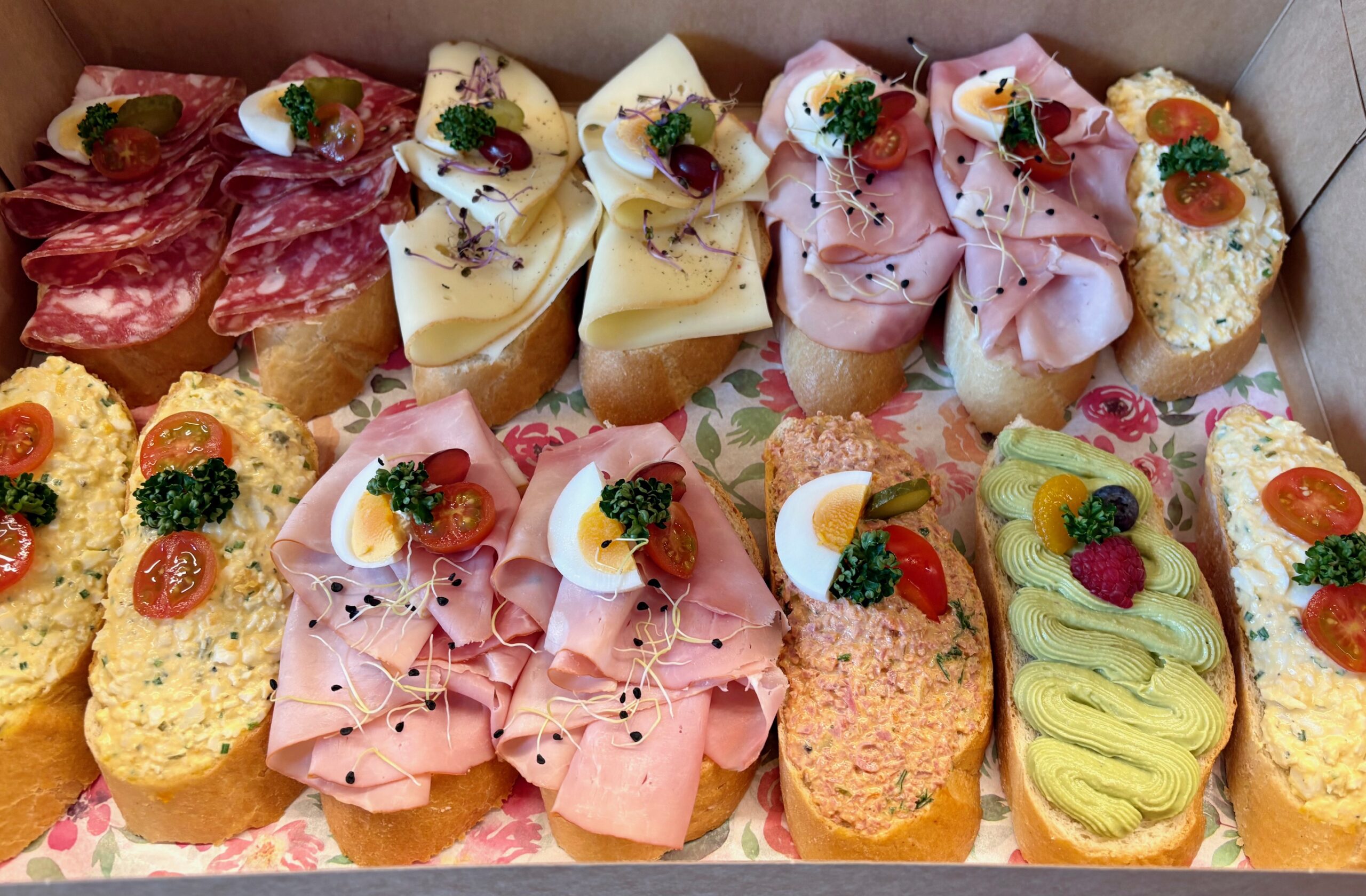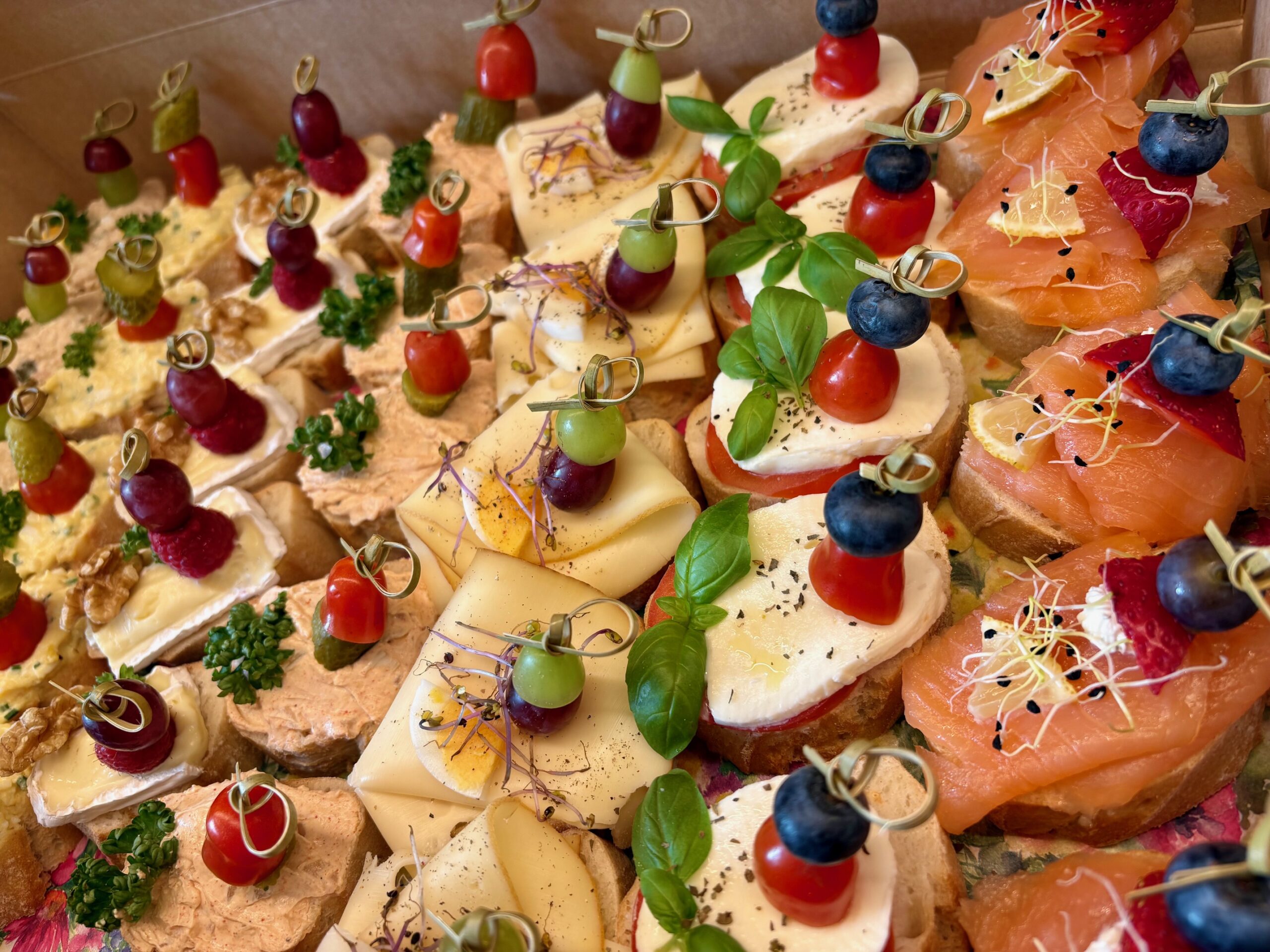 Für unsere vegetarischen Kund*innen bieten wir eine bunte Auswahl an fleischlosen Sorten – ob belegte Brötchen, feine Canapés (Mini-Brötchen) oder Charcuterie-Platten ganz ohne Wurst.