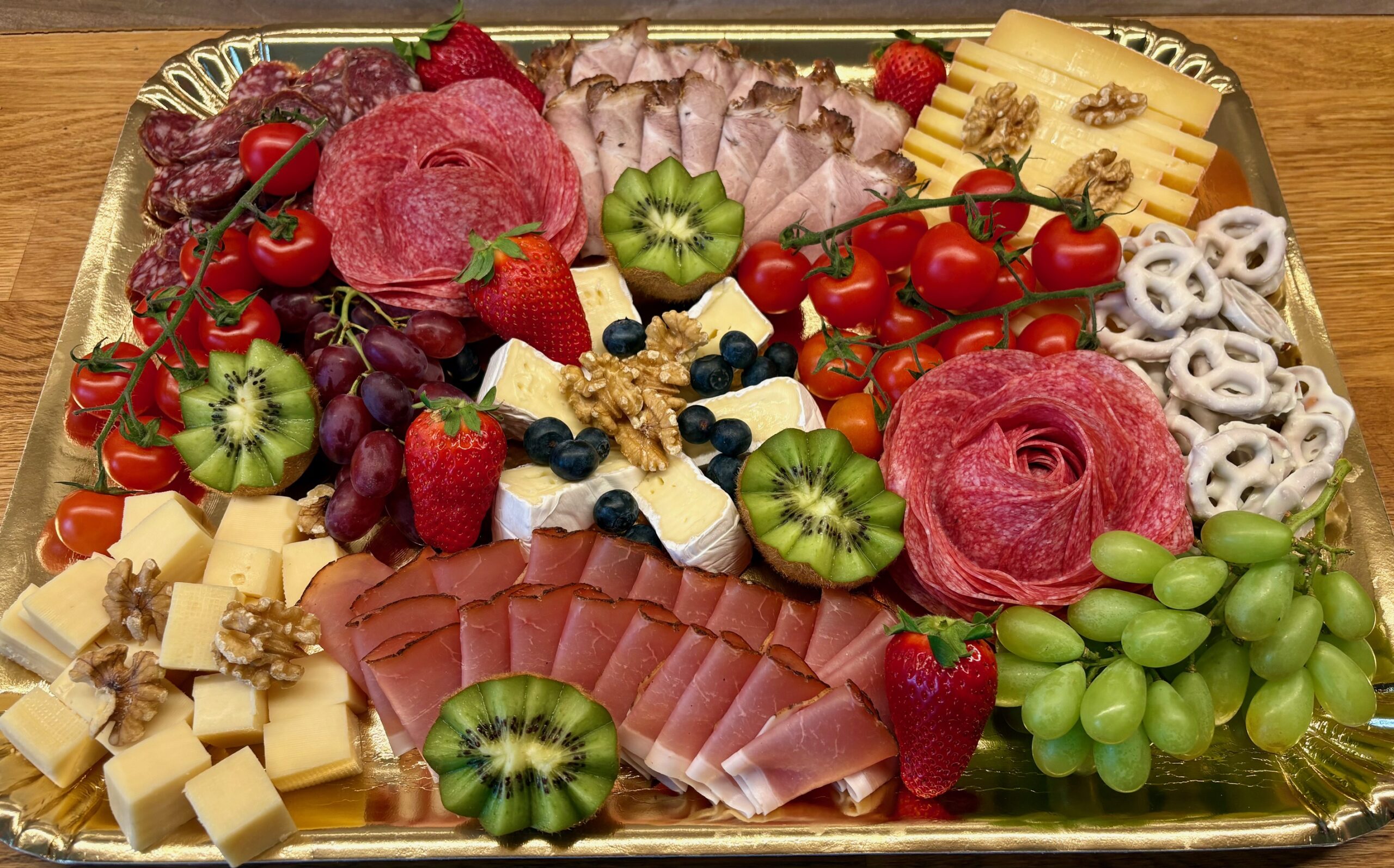Die Platten sind reichlich belegt mit mind. 3 verschiedenen Wurst und Käsesorten, herzhaft dekoriert mit Obst, Gemüse, Süßem, Saurem und Aufstrichen.